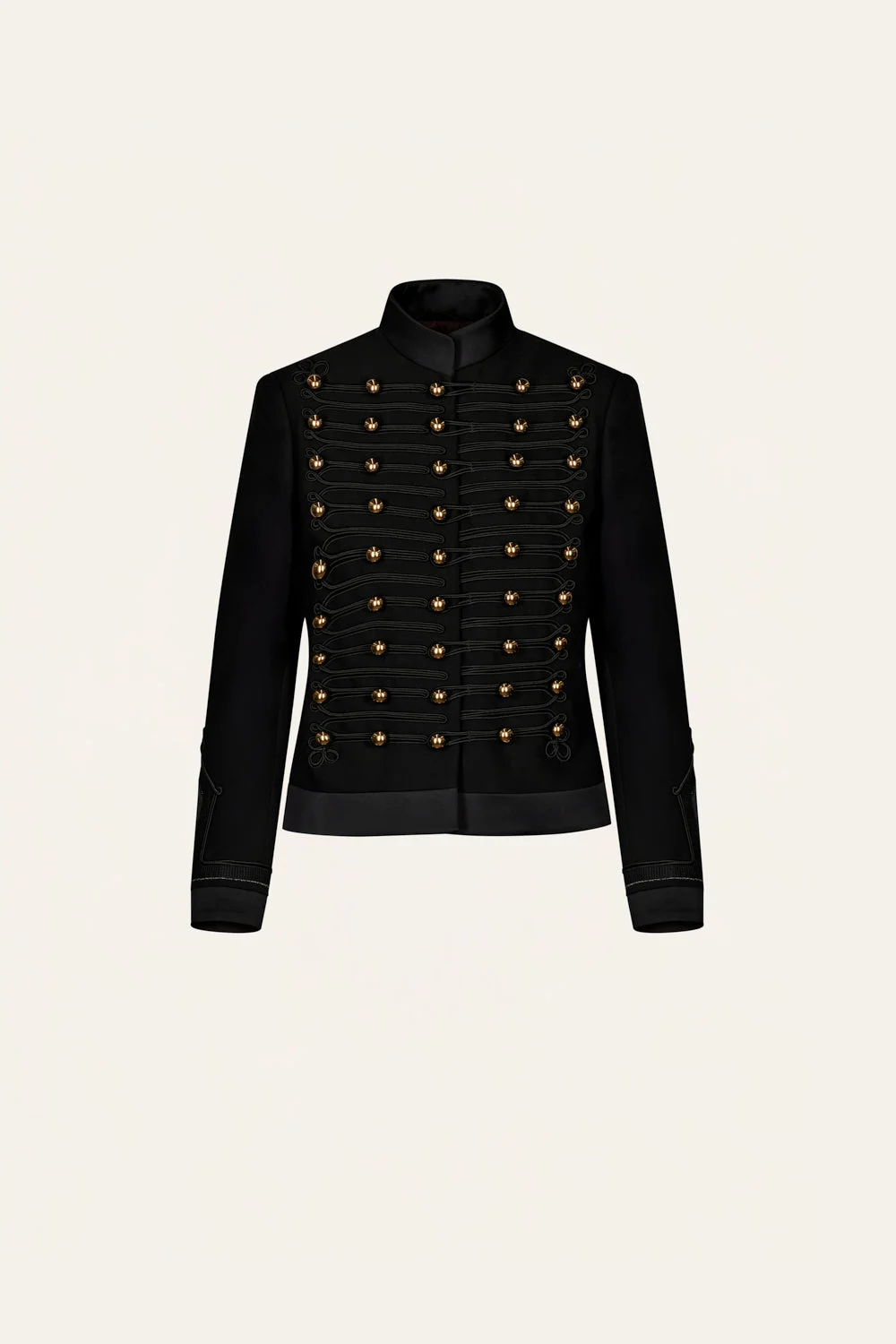 A double-breasted jacket crafted in collaboration with The Extreme Collection. Structured with military-inspired tailoring and finished in bold jacquard with palm tree motifs. Peak lapels and sharp shoulders bring a directional edge to a classic shape. Size and Fit: True to size. Designed for a slim fit. Please refer to our size chart for detailed guidance. Product Details: Closure: Front Buttons Composition: 64% Polyester, 34% Viscose, 2% Elastane Fabrication: Crepe Color: Black Made in Spain