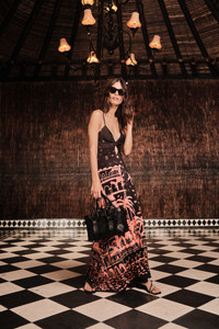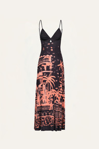 A printed dress crafted in shiny jersey, showcasing a signature Johanna Ortiz landscape print. The effortless silhouette and soft drape make it ideal for warm-weather days and casual evening plans. Size and Fit: True to size. Ankle length. Please refer to our size chart for detailed guidance. Product Details: Closure: Slip On Composition: 96% Viscose, 4% Elastane Fabrication: Shiny Jersey Color: Black/Peach Made in Colombia Dimensions: Length 37.40''