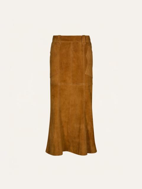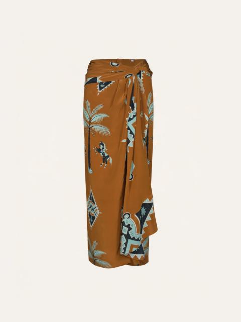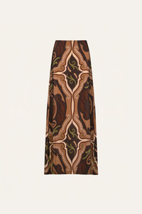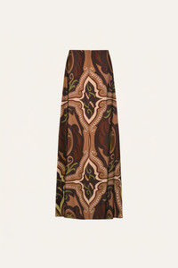 Printed ankle-length skirt with a flowing silhouette and bold, swirling motifs in earthy tones. Cut to create soft volume through the hem for fluid, graceful movement. Size and Fit: - True to size. - Mid-rise. - Please refer to our size chart for detailed guidance. Product Details: Closure: Back Zipper Composition: 100% Silk Fabrication: Silk Cdc Color: Green/Light Pink/Paprika Made in Colombia Dimensions: Length 44.09''