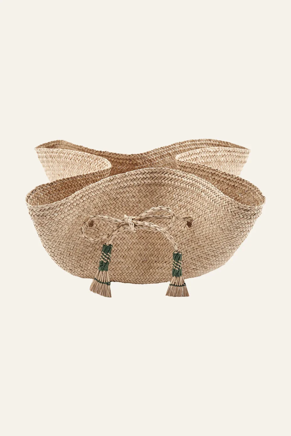 Johanna Ortiz brings back her beloved bread baskets, crafted from iraca fiber and accented with colorful tassels. Available in two sizes, the large includes a napkin with embroidered palm trees, while the smaller ones are ideal for individual use. These baskets combine practicality with artisanal craftsmanship, elevating everyday dining. Product Details: Composition: 100% Natural Fiber/Iraca Palm Fabrication: Natural Fiber/Iraca Palm Basket Color: Dark Jungle Set of 2 Made in Colombia Dimensions: Length 9.84'', Width 9.84'', Height 3.54''