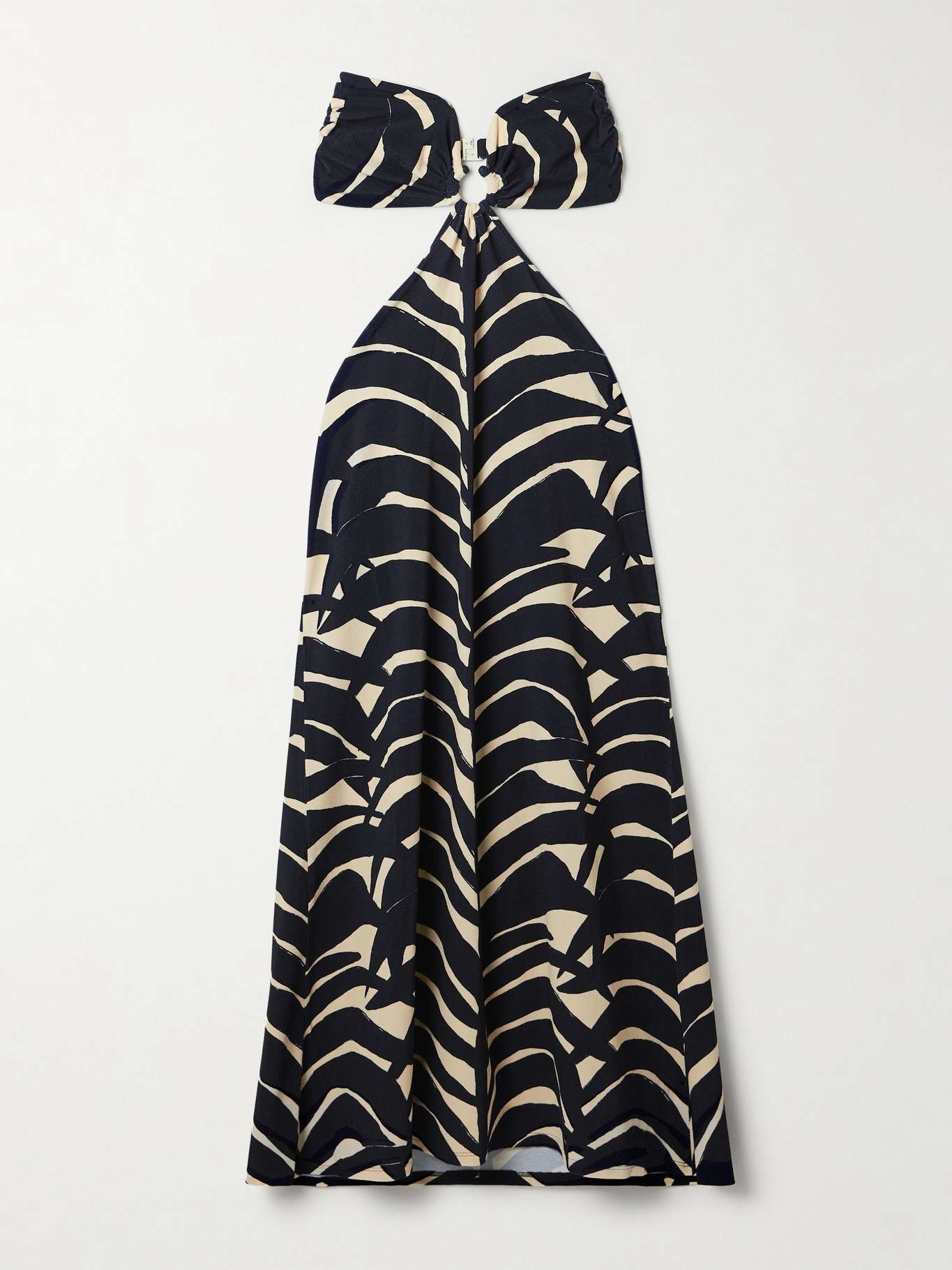 EDITORS'NOTES Johanna Ortiz's maxi dress is printed with a layered palm tree motif that resembles abstract stripes from afar. It's made from comfortable stretch-knit and has waist-baring cutouts at the sides. A ring embellishment on the sweetheart neckline adds structure. SIZE & FIT Model measurements: - Fits true to size, take your normal size - Designed to be fitted at the bust and waist, slightly loose at the hip - Mid-weight knit - Model is 175cm/ 5'9" and is wearing a US 2 - Bust: 78.1cm/ 30.75" - Waist: 64.7cm/ 25.5" - Hip: 91.4cm/ 36" DETAILS & CARE - Navy and ecru stretch-knit - Clasp fastening at back - 85% polyamide, 15% elastane