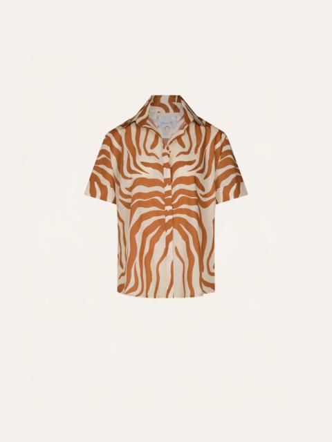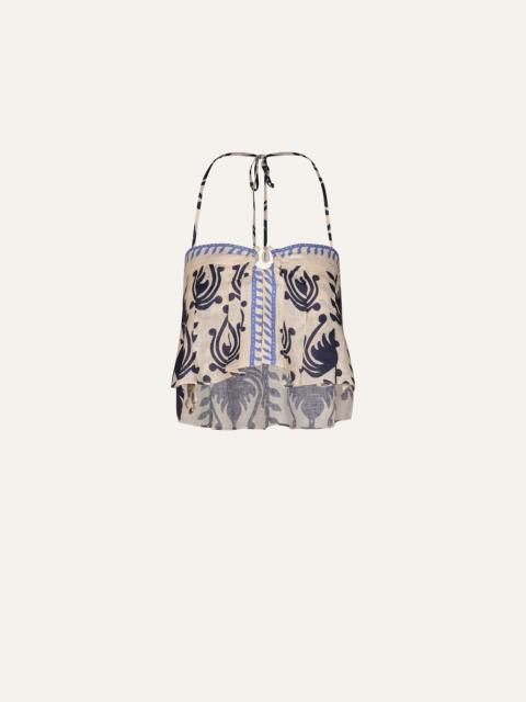 A halter top cut in light linen, in ecru and navy with a JO print. Designed with a layered hem, front ring detail, and adjustable tie fastening at the neck. Pair with the matching skirt for a coordinated look. Size and Fit: True to size. Cropped length with adjustable straps. Please refer to our size chart for detailed guidance. Product Details: Closure: Slip On Composition: 100% Linen Fabrication: Light Linen Color: Ecru/Navy Made in Colombia