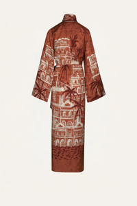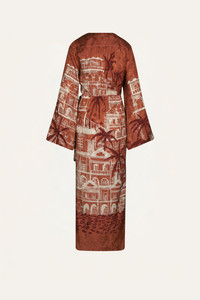 A wrap-around dress crafted in printed jacquard and adorned with one of Johanna Ortiz’s signature architectural landscape prints. It features a waist tie and coordinating scarf that add movement and sophistication—ideal for daytime gatherings or dinner occasions. Size and Fit: True to size. Ankle length. Please refer to our size chart for detailed guidance. Product Details: Closure: Wrap Around Composition: 100% Viscose Fabrication: Printed Jacquard Color: Marsala/Ecru Made in Colombia Dimensions: Length 37.40''