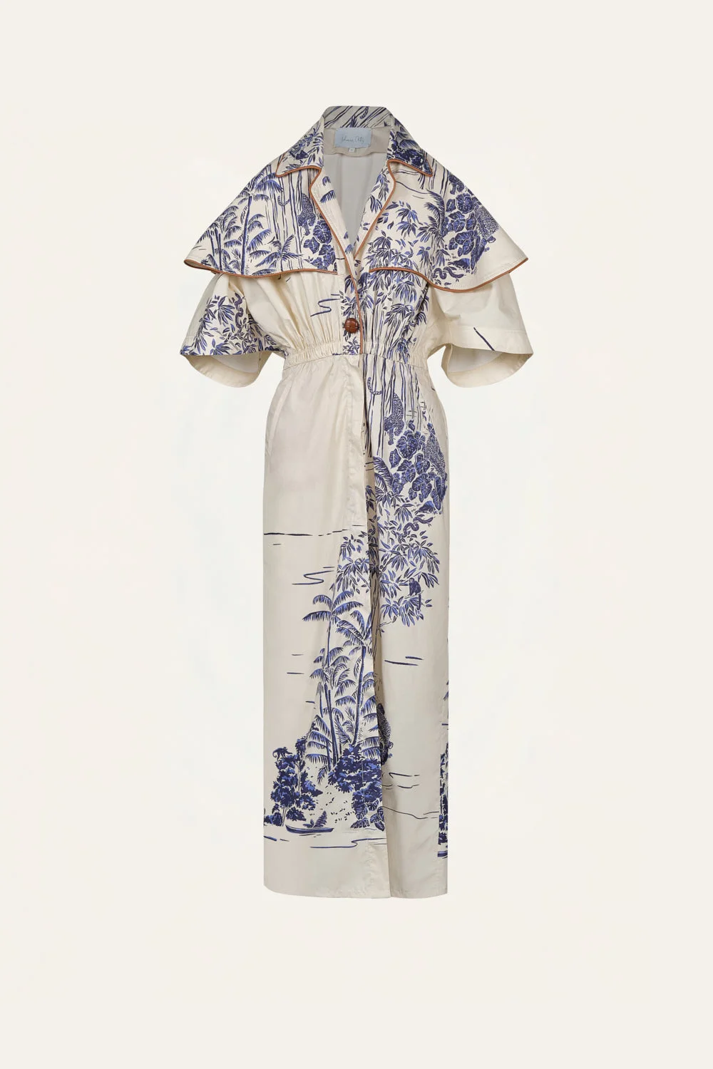 A long cotton trench featuring a graphic toile print and a sculptural cape detail. Designed with a fluid silhouette and subtle volume, it brings an expressive yet effortless presence to the collection, ideal for spring weather. Size and Fit: - True to size. Please refer to our size chart for detailed guidance. Product Details: Closure: Front Buttons Composition: 85% Cotton, 15% Polyester Fabrication: Cotton Color: Ecru/Navy Made in Colombia Dimensions: Length 37.40''