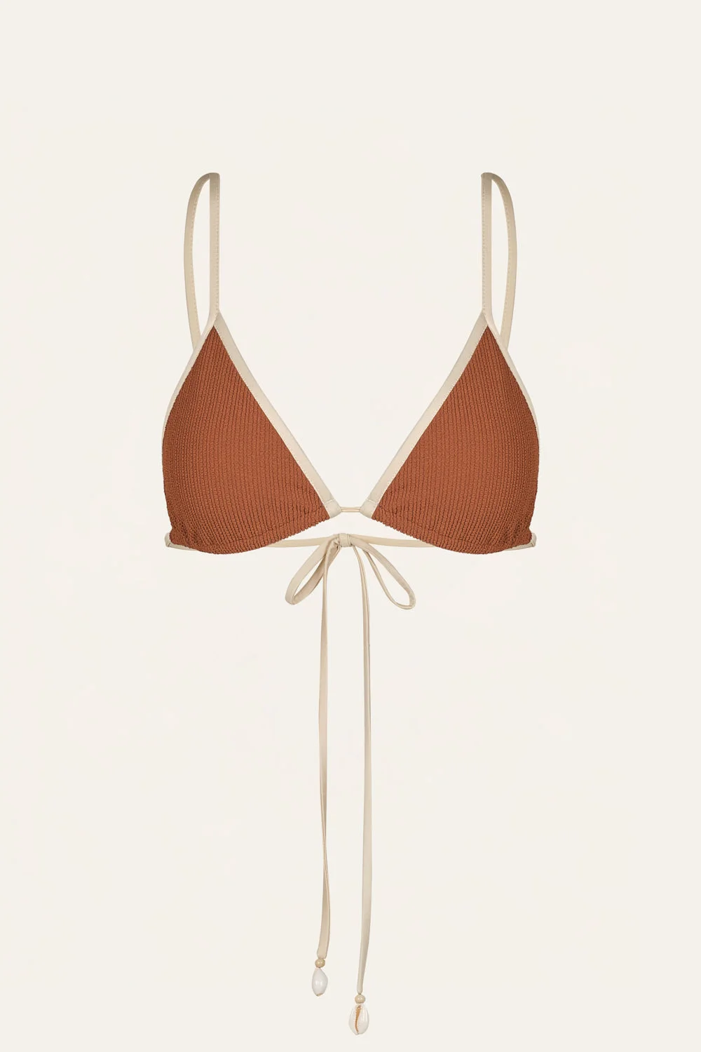 A triangle bikini top in crinkle Lycra, in mocca and ecru. Defined by contrast trim and adjustable ties, it offers a sleek and modern take on a timeless silhouette. Pair with the matching bikini bottom for a coordinated look. Size and Fit: Designed for a slim fit. Adjustable ties at the neck and back. Please refer to our size chart for detailed measurements and guidance. Product Details: Closure: Tie At Back Composition: 88% Recycled Polyamide, 12% Elastane Fabrication: Crinkle Lycra Color: Mocca/Ecru Made in Colombia