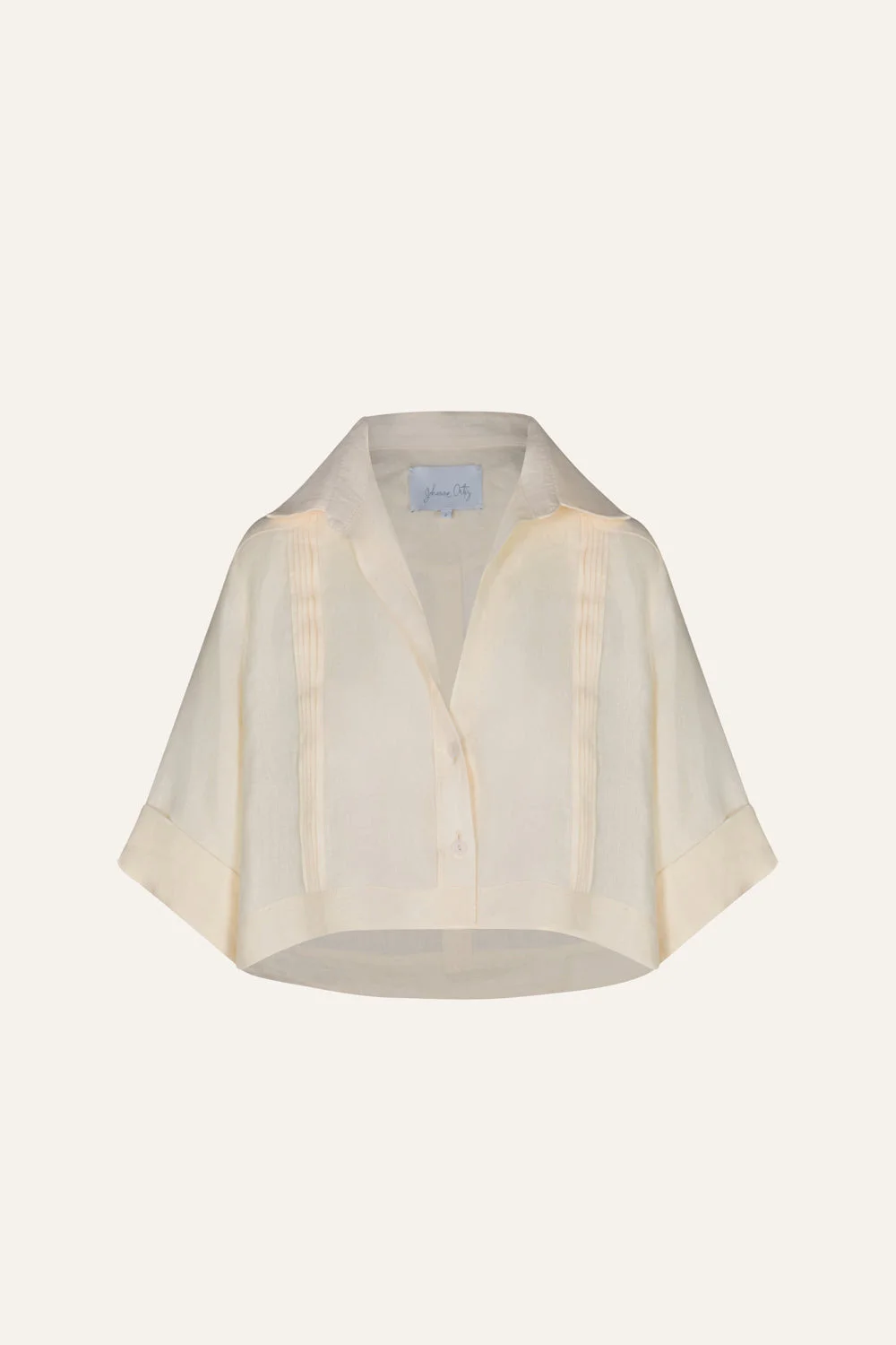 A classic Johanna Ortiz piece, this organic linen shirt embodies effortless sophistication. Featuring delicate pintucks, a V-neckline, and a breezy cropped silhouette, it’s designed to complement high-waisted separates or layer effortlessly over swimwear for an elevated resort look. Size and Fit: - Boxy fit. - Cropped. - Please refer to our size chart for detailed guidance. Product Details: Closure: Front Buttons Composition: 100% Organic Linen Fabrication: Linen Color: Ecru Made in Colombia