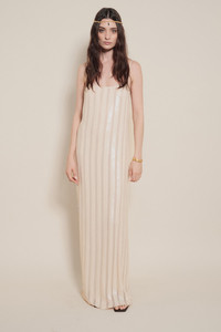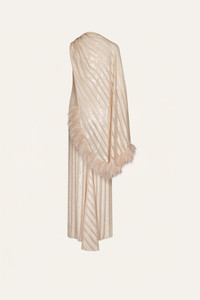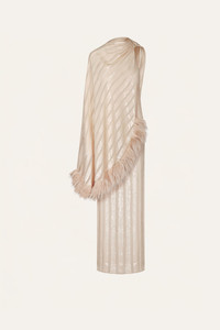 A sequined dress with vertical stripe detailing and an optional cape overlay trimmed in tonal feathers. Wear with or without the cape depending on the occasion. Pair with heels for a striking evening look. Size and Fit: True to size. Designed for a slim fit. Please refer to our size chart for detailed guidance. Product Details: Closure: Back Zipper Composition: 100% Viscose Fabrication: Sequins Color: Ecru Made in India Dimensions: Length 44.09''
