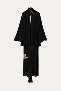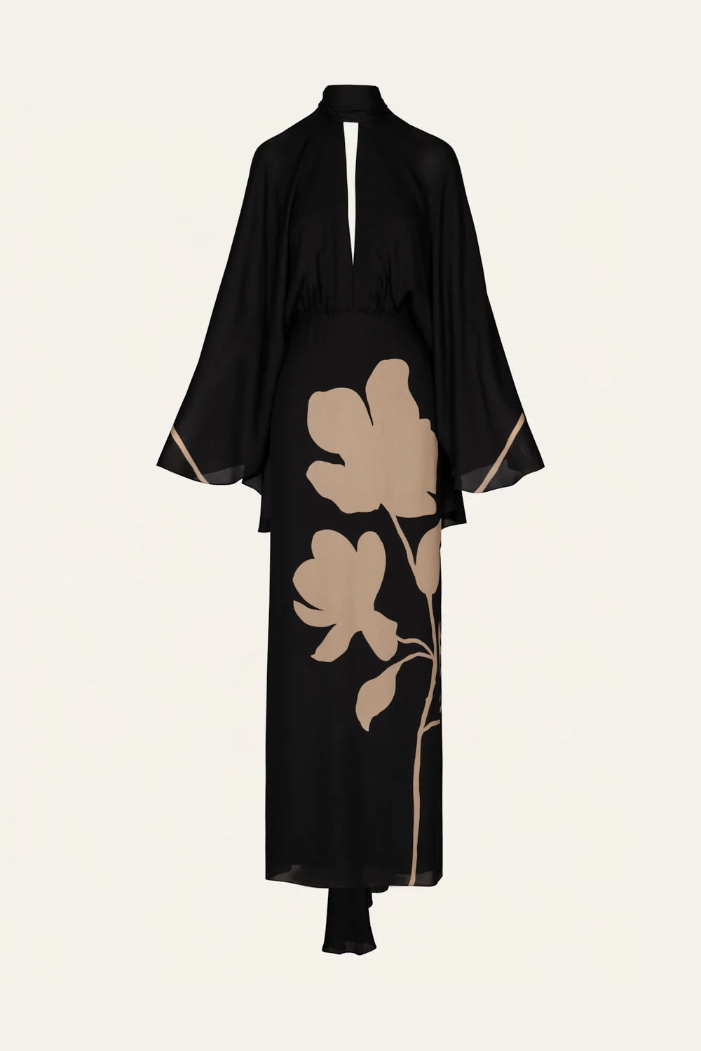 A long dress in lightweight silk with a halter neckline and wide, flared sleeves. The oversized floral placement motif adds impact against the minimalist shape. Wear it with sculptural heels and simple jewelry to highlight its elegance. Size and Fit: True to size. Designed for a relaxed fit. Please refer to our size chart for detailed guidance. Product Details: Closure: Back Zipper Composition: 100% Silk Fabrication: Silk Double Georgette Color: Black/Sand Made in Colombia Dimensions: Length 36.22''