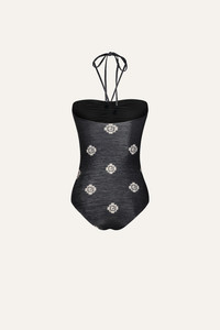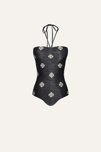 A shimmering strapless one-piece with subtle ruching and geometric embroidered tassels. Designed for a sleek silhouette, effortlessly pairing with the matching Keel Midi Skirt for a polished resort look. Size and Fit: - True to size. - Adjustable tie fastening at the neck. - Please refer to our size chart for detailed guidance. Product Details: Closure: Slip On Composition: 67% Polyester, 21% Polyamide, 12% Elastane Fabrication: Shimmering Lycra Color: Black/Ecru Made in Colombia