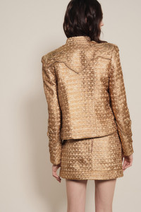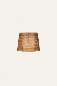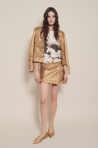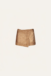 A mini skirt in Lurex jacquard with a wrap-effect front and soft structure. Designed to sit high on the waist, it brings texture and light to both dressed-up and casual looks. Wear it with the matching jacket for a statement set, or pair it with a printed tee for contrast. Size and Fit: True to size. Designed for a slim fit. Please refer to our size chart for detailed guidance. Product Details: Closure: Back Zipper Composition: 45% Acrylic, 41% Cellulose Acetate, 14% Polyester Fabrication: Lurex Jacquard Color: Gold Made in Colombia Dimensions: Length 15.75''