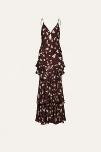A long silk dress with a plunging neckline and tiered ruffles throughout. The lightweight construction adds soft movement, while the allover heart motif brings a playful contrast. Wear it on its own or pair with the matching cape for a more statement approach. Size and Fit: True to size. Designed for a slim fit. Please refer to our size chart for detailed guidance. Product Details: Closure: Slip On Composition: 100% Silk Fabrication: Silk Cdc Color: Dark Chocolate/Ecru/Red Made in Colombia Dimensions: Length 45.28''