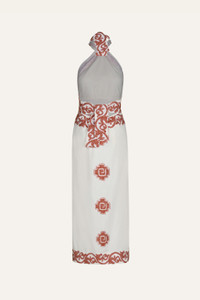 An ankle-length embroidered cotton dress featuring an open-back design and a flowing silhouette. The halter neckline and intricate detailing add a refined touch, making it a standout piece for warm-weather dressing. Size and Fit: - Oversized fit for a relaxed silhouette. - Please refer to our size chart for detailed guidance. Product Details: Closure: Tie At Back Composition: 100% Cotton Fabrication: Embroidered Cotton Color: Ecru/Red Made in Colombia Dimensions: Length 37.4''