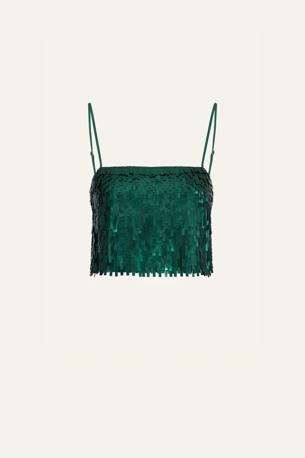 A green sequin top, the ultimate choice for making a statement at unforgettable events or a night out. Product Details: Closure: Back Zipper Composition: Polyester 50%, Polyvinylchloride 50% Fabrication: Feathered Sequin Color: Forest Green Made in India