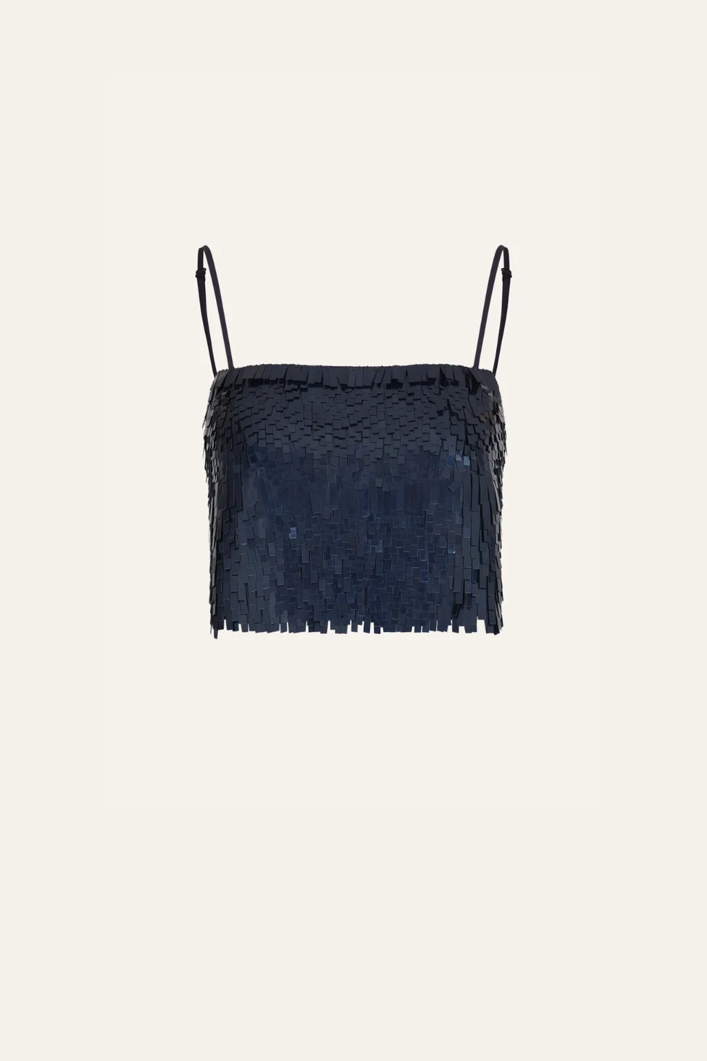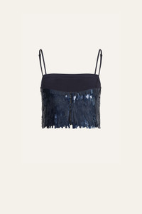 A blue sequin top, the ultimate choice for making a statement at unforgettable events or a night out. Product Details: Closure: Back Zipper Composition: Polyester 50%, Polyvinylchloride 50% Fabrication: Feathered Sequin Color: Midnight Blue Made in India