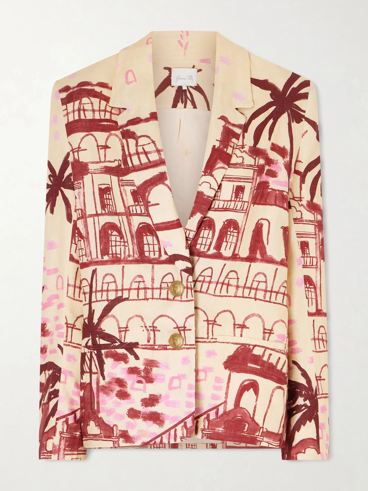 Johanna Ortiz's 'Rock The Plan' blazer has been crafted in Colombia from airy linen, illustrated with a palm-fringed scene that evokes effortless escape. Tailored with sharp notch lapels, it's finished with tropical-engraved buttons that subtly catch the light.