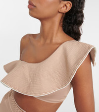 Make a splash in this bikini top by Johanna Ortiz. This asymmetric style has a one-shoulder neckline with a ruffled panel, contrast topstitch detailing, and a close-fitting base. Product Details - Closure: self-ties - Made in Colombia - Lining: partially lined, 20% elastane, 80% polyamide - Designer color name: Ecru - Care instructions: dry clean - Material: 22% elastane, 78% recycled polyester - Item number: P00742310 Size & Fit - True to size - The model seen in the picture is 178cm-5'10", cup size B, and wearing a size XS - Unpadded Top