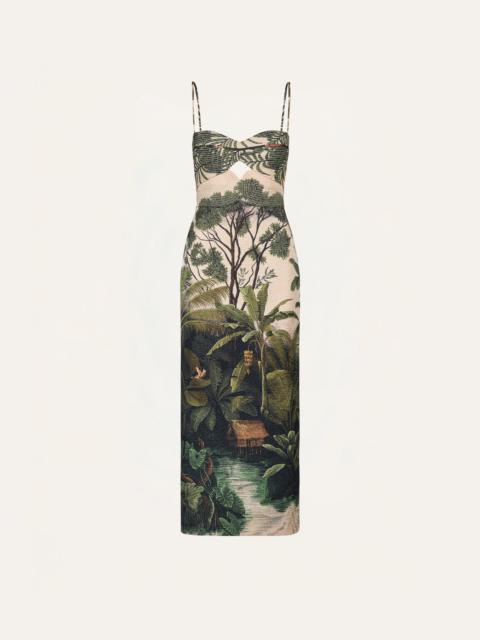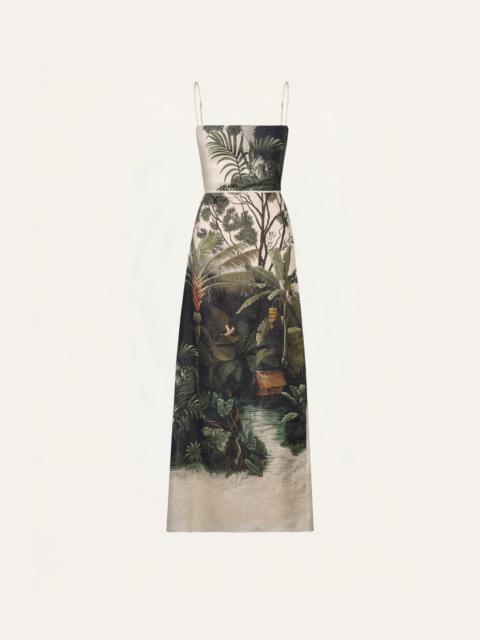 A maxi dress crafted in heavy crepe with an expressive floral print. Designed with a halter neckline and a clean, elongated silhouette. Ideal for evening occasions, styled with statement accessories from the collection. Size and Fit: - True to size. Please refer to our size chart for detailed guidance. Product Details: Closure: Back Zipper And Button Composition: 95% Viscose, 5% Elastane Fabrication: Heavy Crepe Color: Wine/Red Made in Colombia Dimensions: Length 45.28''