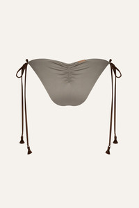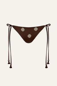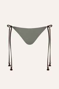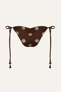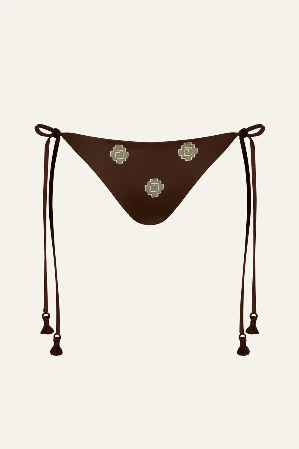 A low-rise tie-side bikini bottom offering a timeless silhouette with a modern Johanna Ortiz twist. Fully reversible for versatile styling, it features embroidered tassels and effortlessly pairs with coordinating bikini tops from the collection. Size and Fit: - Runs small based on customer feedback; consider sizing up for the best fit. - Low-rise. - Adjustable tie sides. - Please refer to our size chart for detailed guidance. Product Details: Closure: Tie On Side Composition: 78% Recycled Polyamide, 22% Elastane Fabrication: Printed Lycra Color: Dark Chocolate/Light Green Made in Colombia