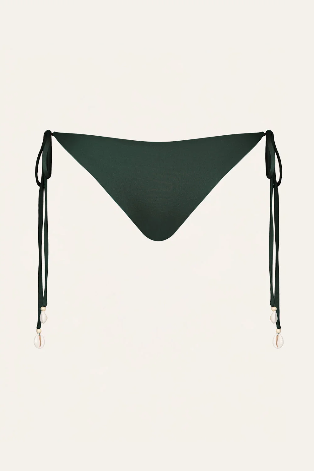 A low-rise tie-side bikini bottom offering a timeless silhouette with a modern Johanna Ortiz twist. Finished with embroidered tassels, it pairs effortlessly with coordinating bikini tops from the collection. Size and Fit: Runs small based on customer feedback; consider sizing up for the best fit. Low-rise. Adjustable tie sides. Please refer to our size chart for detailed guidance. Product Details: Closure: Tie On Side Composition: 80% Polyamide, 20% Elastane Fabrication: Lycra Color: Dark Green Made in Colombia