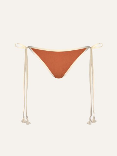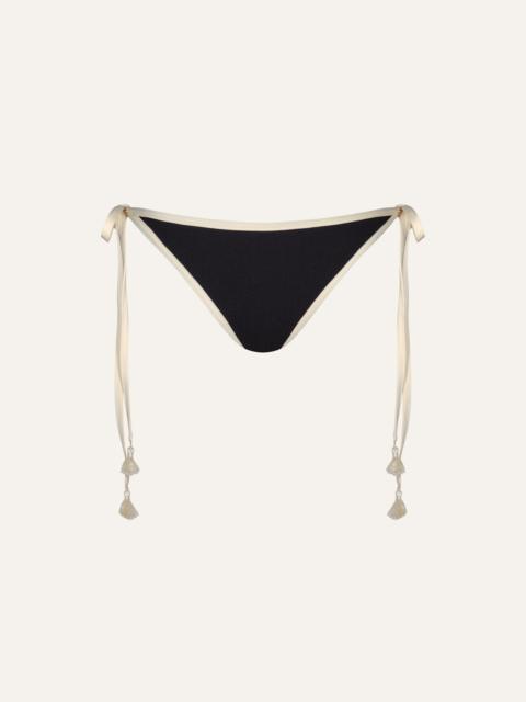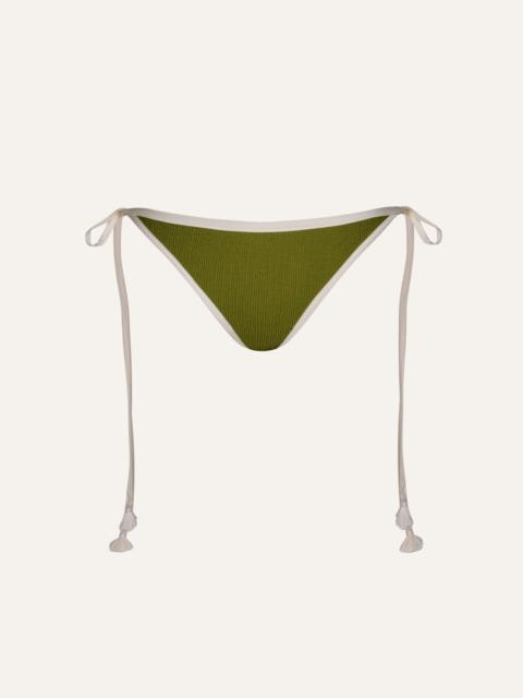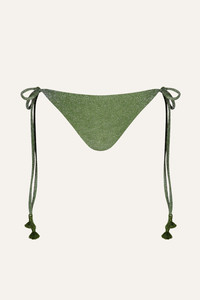 A low-rise tie-side bikini bottom with embroidered tassels. A timeless silhouette reimagined with the Johanna Ortiz twist. Designed to be styled with coordinating bikini tops from the collection for a complete look. Size and Fit: - Runs small based on customer feedback; consider sizing up for the best fit. - Low-rise. - Adjustable tie sides. - Please refer to our size chart for detailed guidance. Product Details: Closure: Tie On Side Composition: 66% Recycled Polyamide, 26% Metallic Silver, 8% Elastane Fabrication: Shimmering Lycra Color: Maguey Green Made in Colombia
