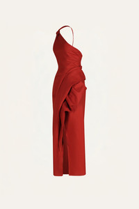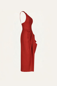 A linen midi dress featuring an asymmetric neckline with a knotted shoulder detail and soft draping through the skirt. Its timeless silhouette and refined construction make it a standout choice for daytime events or warm evening occasions. Size and Fit: True to size. Midi length. Please refer to our size chart for detailed guidance. Product Details: Closure: Back Zipper Composition: 100% Linen Fabrication: Linen Color: Red Made in Colombia Dimensions: Length 36.22''