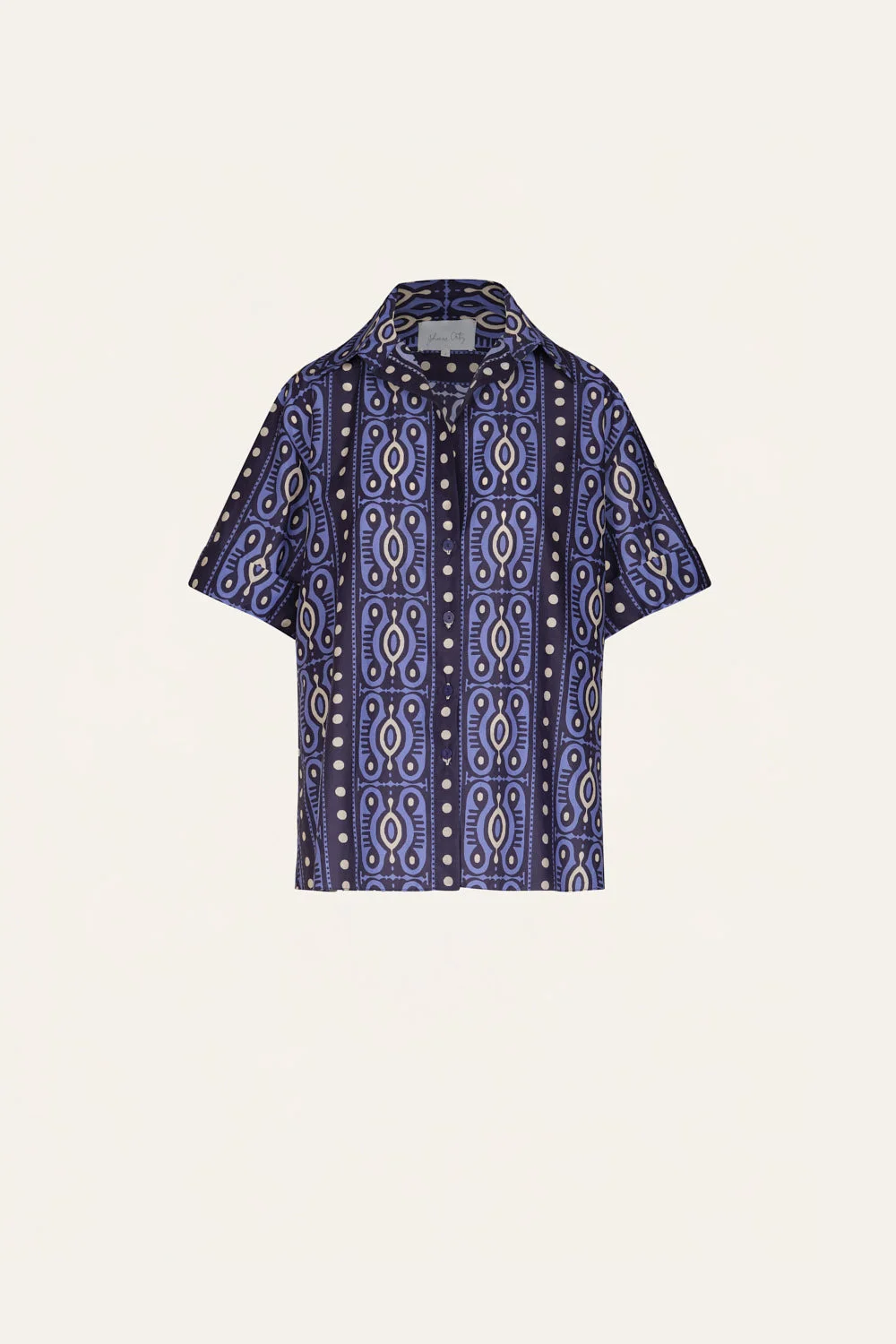 A short-sleeve shirt cut in light poplin. Defined by its oversized fit and JO print, it offers ease and versatility, perfect for layering over swimwear or pairing with tailored bottoms for a statement look. Size and Fit: Oversized fit for a relaxed silhouette. Please refer to our size chart for detailed guidance. Product Details: Closure: Front Buttons Composition: 100% Cotton Fabrication: Light Popling Color: Navy/Ecru Made in Colombia