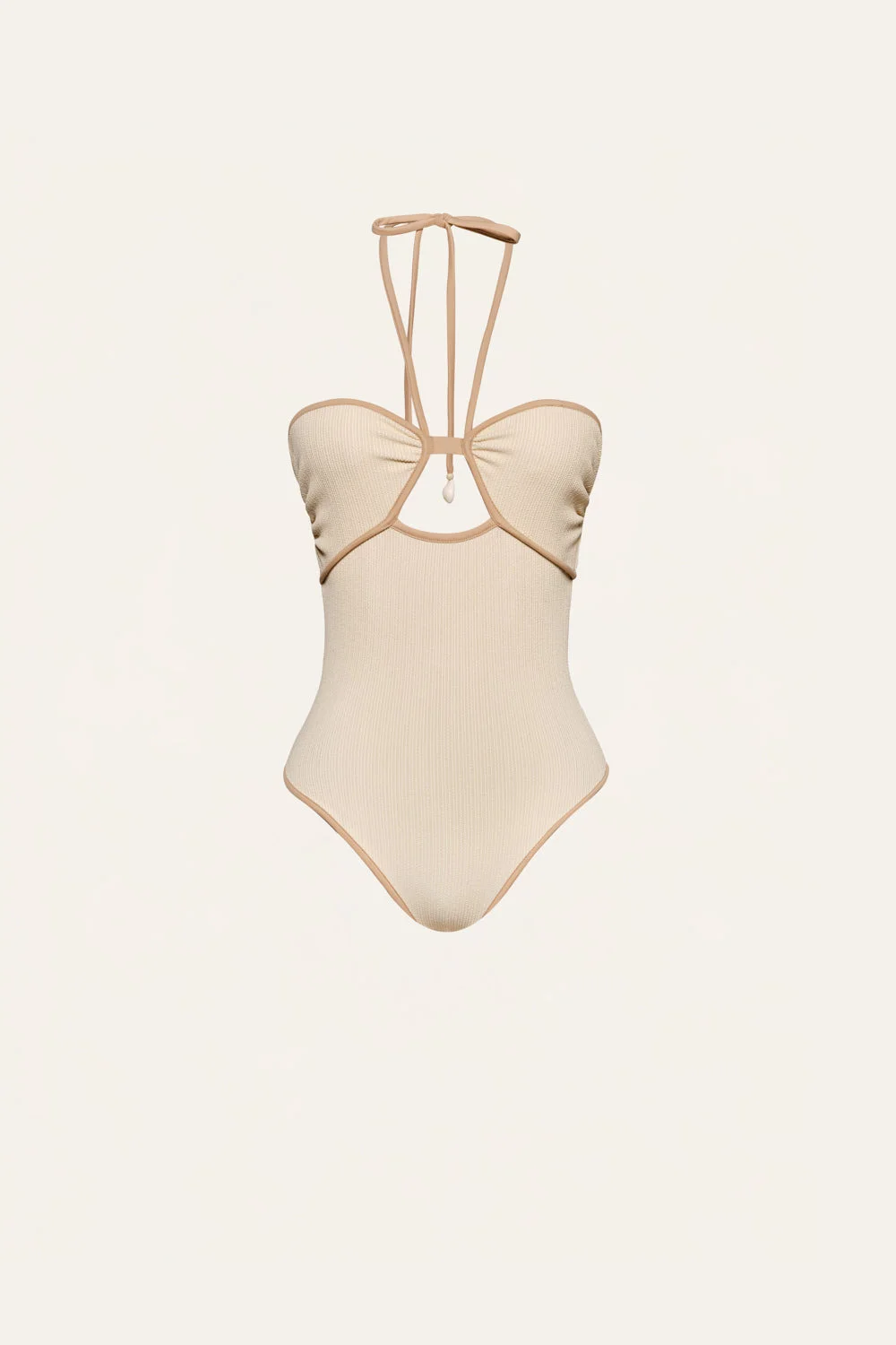 A one-piece featuring a keyhole detail and an adjustable tie fastening at the neck. Its refined silhouette offers both support and versatility, making it a standout piece for resort wear. Finished with embroidered tassels for an artisanal touch. Size and Fit: True to size. Adjustable tie fastening at the neck. Please refer to our size chart for detailed guidance. Product Details: Closure: Slip On Composition: 88% Recycled Polyamide, 12% Elastane Fabrication: Crinkle Lycra Color: Ecru/Nude Made in Colombia