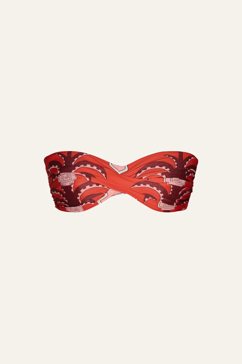 A strapless bikini top in printed lycra with ruched detailing. Designed for a sleek fit, it pairs effortlessly with the matching bikini bottom or mix-and-match styles from the collection. Size and Fit: - Runs small on the bust based on customer feedback. - Please refer to our size chart for detailed guidance. Product Details: Closure: Tie Fastening Composition: 78% Recycled Polyamide, 22% Elastane Fabrication: Printed Lycra Color: Red/Wine/Pink Made in Colombia