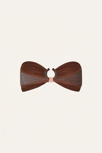 A strapless bikini top featuring a beaded ring at the center and contrast binding for a standout look. Designed to be mixed and matched with coordinating pieces from the collection. Size and Fit: True to size. Please refer to our size chart for detailed guidance. Product Details: Closure: Tie Fastening Composition: 66% Recycled Polyamide, 26% Metallic Silver, 8% Elastane Fabrication: Lycra Lurex Color: Brown Made in Colombia