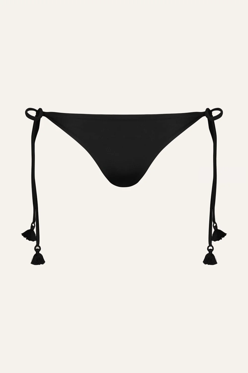 A low-rise tie-side bikini bottom with embroidered tassels. A timeless silhouette reimagined with the Johanna Ortiz twist. Designed to be styled with coordinating bikini tops from the collection for a complete look. Size and Fit: - Runs small based on customer feedback; consider sizing up for the best fit. - Low-rise. - Adjustable tie sides. - Please refer to our size chart for detailed guidance. Product Details: Closure: Tie On Side Composition: 78% Recycled Polyamide, 22% Elastane Fabrication: Lycra Color: Black Made in Colombia