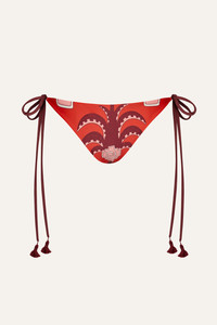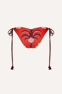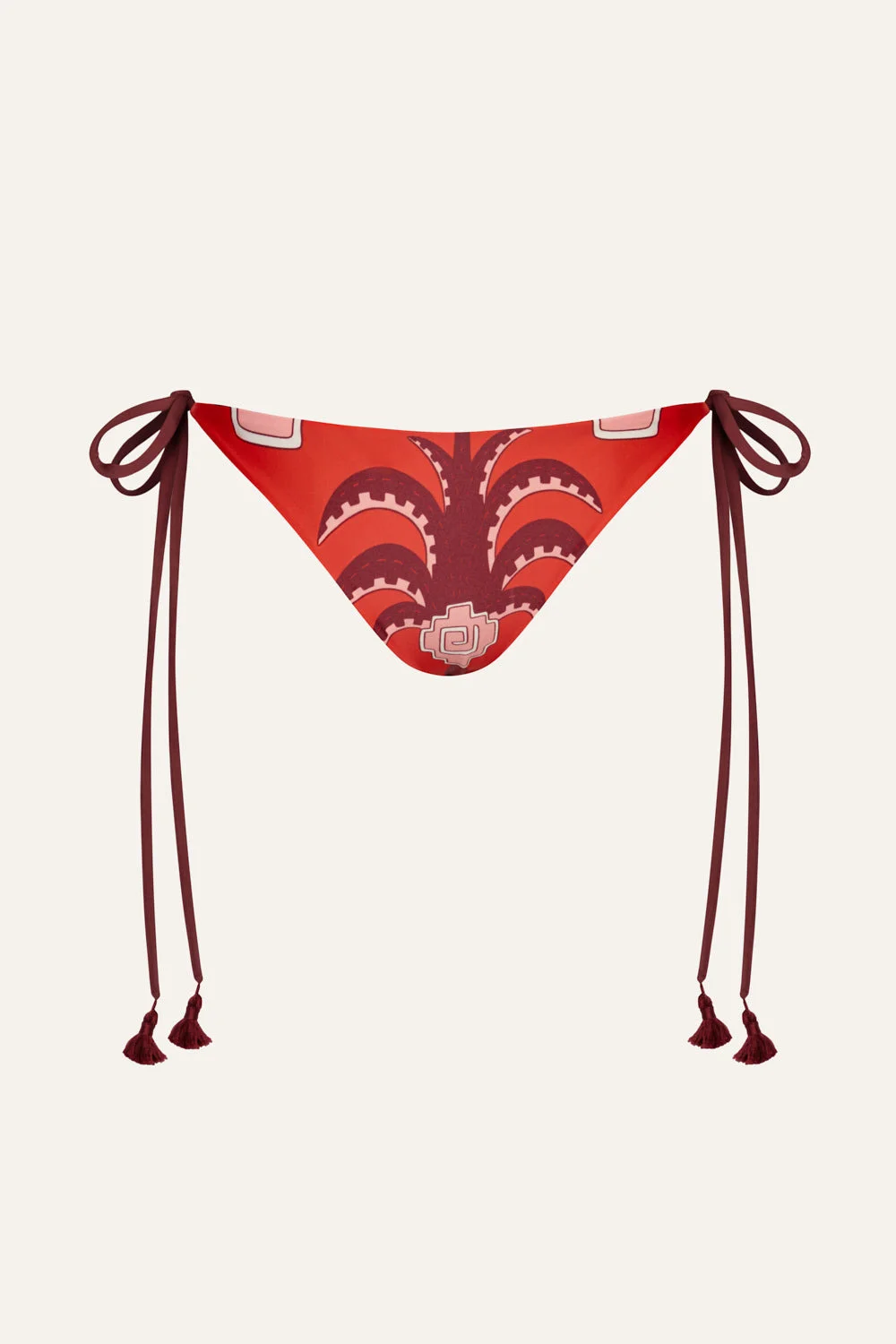 A low-rise tie-side bikini bottom offering a timeless silhouette with a modern Johanna Ortiz twist. Fully reversible for versatile styling, it features embroidered tassels and effortlessly pairs with coordinating bikini tops from the collection. Size and Fit: - Runs small based on customer feedback; consider sizing up for the best fit. - Low-rise. - Adjustable tie sides. - Please refer to our size chart for detailed guidance. Product Details: Closure: Tie On Side Composition: 78% Recycled Polyamide, 22% Elastane Fabrication: Printed Lycra Color: Red/Wine/Pink Made in Colombia