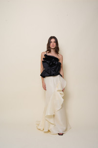 A strapless silk duchess top with dramatic ruffle detailing, creating a bold and sculptural silhouette. Pair with the coordinating skirt for an elegant, cohesive ensemble. Size and Fit: Runs small based on customer feedback; consider sizing up for the best fit. Structured design. Please refer to our size chart for detailed guidance. Product Details: Closure: Back Zipper Composition: 100% Silk Fabrication: Duchess Color: Black Made in Colombia