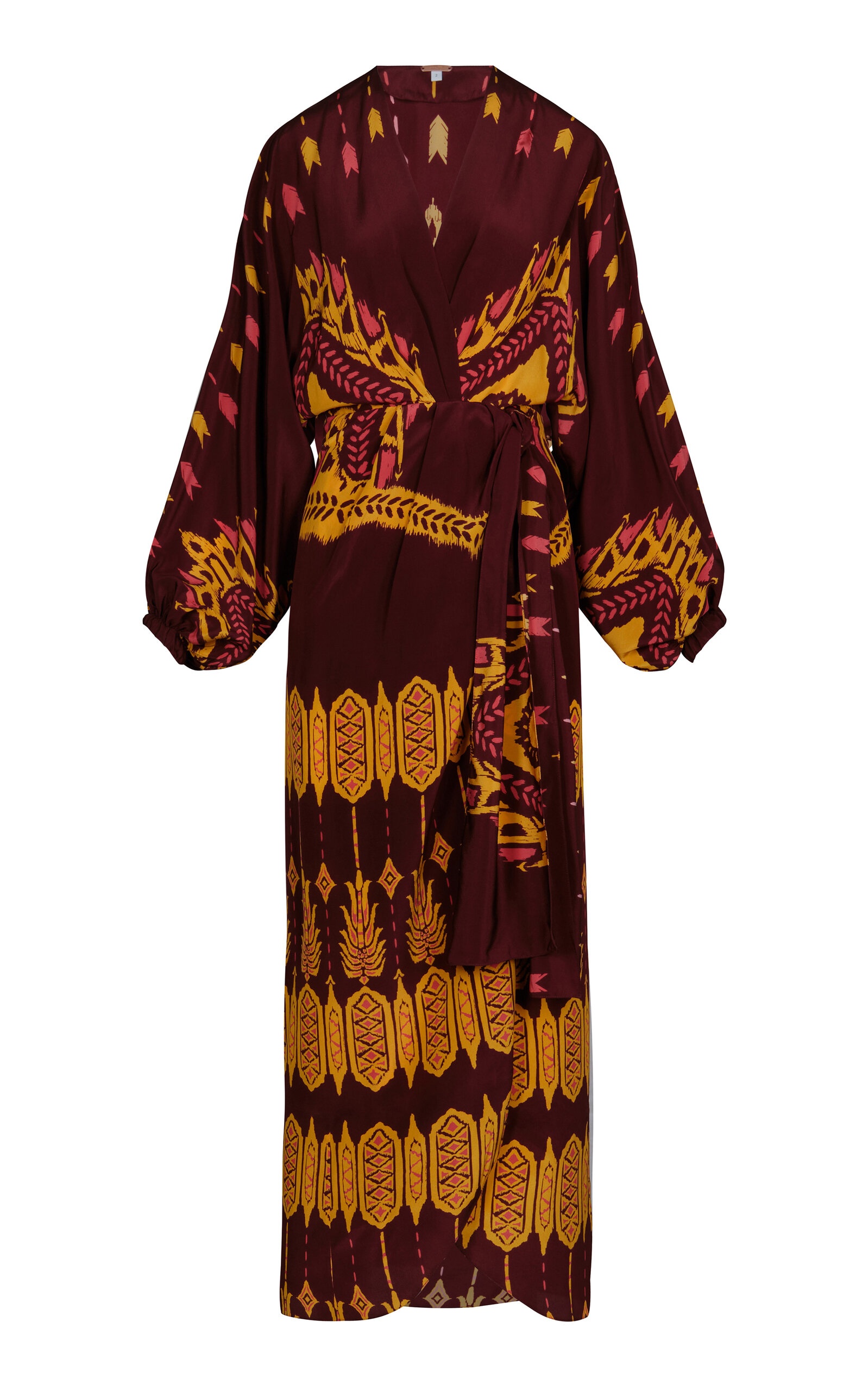 PRODUCT DETAILS - As featured in the Johanna Ortiz Pre-Fall '24 lookbook - Regular fit, long sleeves, V-neck, side slit hem - Unlined - Composition: 100% Silk - Color: Nomadic Brown-Yellow-Pink - Wraps around - Made in Colombia