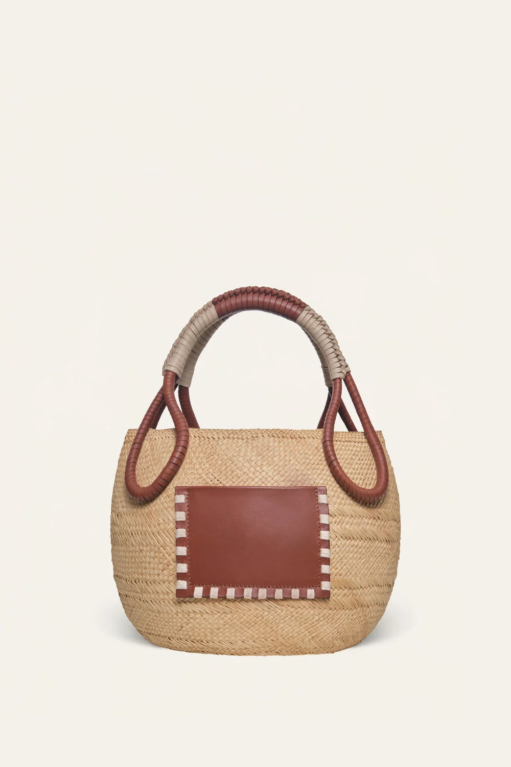 This beautifully constructed egg-shaped basket bag is a standout piece in JO's bag collection and all-time iconic. In this collection, the bag's outside pocket is adorned with creative and colorful embroideries, reminiscent of the patterns found in the tunics throughout the collection, echoing the tribal language expressed throughout the entire lineup. Product Details: Closure: Open Top with Tie Strap Closure Composition: 60% Natural Fiber (Iraca Palm and Tagua), 34% Cow Leather, 3% Cotton, 3% Viscose Fabrication: Iraca Bag With Leather Handle, Cotton And Viscose Raffia Embroidery Color: Camel/Rust/Ecru Made in Colombia Dimensions: Length 13.78'', Width 9.84'', Height 9.45'', Drop 5.91''