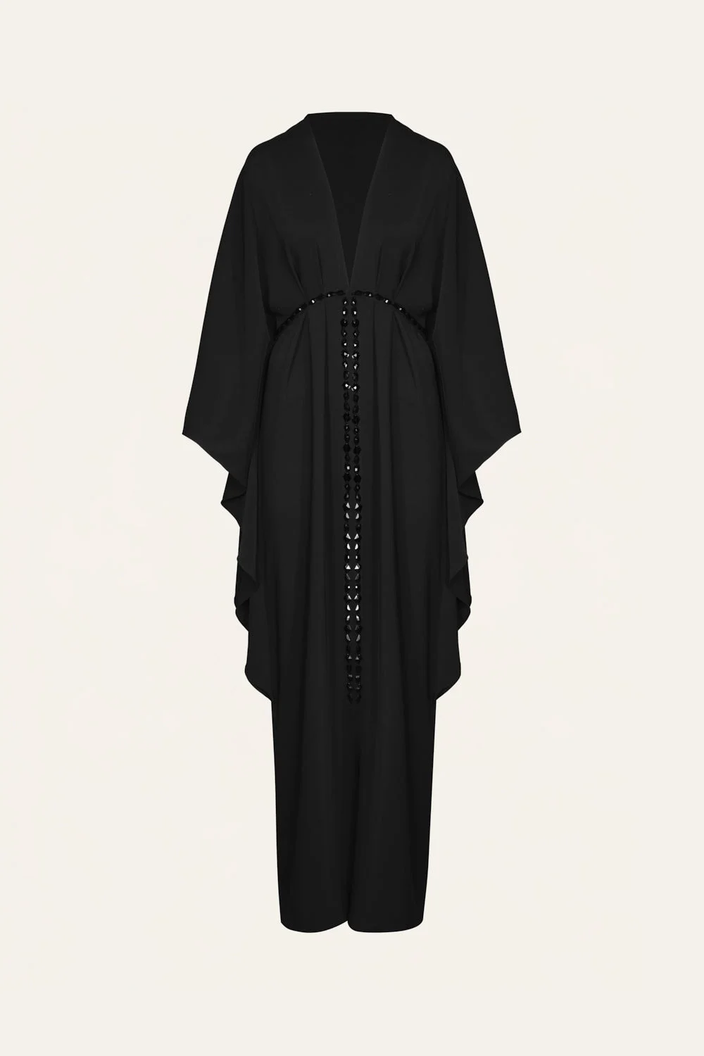 Tunic dress in soft crepe featuring wide sleeves, a deep neckline, and tonal embellishments inspired by birds in flight. Finished with tassel detailing and a front slit for fluid movement. Size and Fit: - True to size. - Boxy fit. - Please refer to our size chart for detailed guidance. Product Details: Closure: Slip On Composition: 100% Polyester & Stone Glass Fabrication: Crepe Birds Color: Black Made in Colombia Dimensions: Length 44.09''