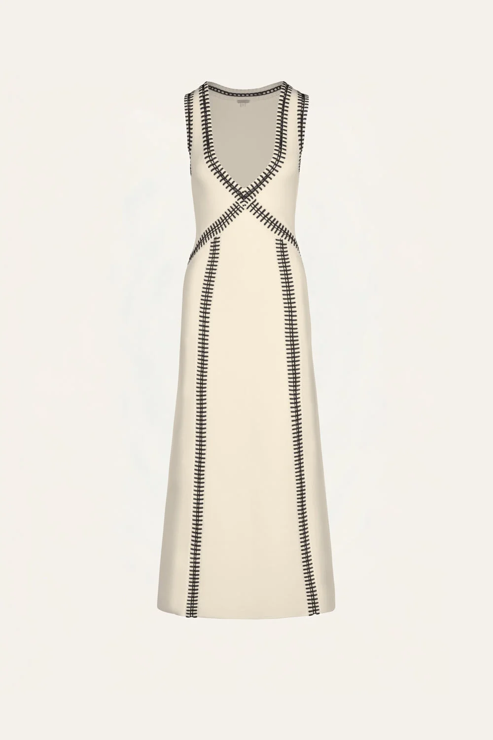 A sleek knit midi dress detailed with contrasting stitched lines that create a sculptural effect. Designed with a deep V-neckline, this piece offers an elevated yet effortless look that transitions seamlessly from day to night. Size and Fit: Runs small based on customer feedback; consider sizing up for the best fit. Midi length. Please refer to our size chart for detailed guidance. Product Details: Closure: Slip On Composition: 83% Viscose, 17% Polyester Fabrication: Viscose Color: Ecru/Black Made in China Dimensions: Length 36.22''