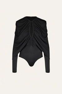 A jersey bodysuit with a draped front, gathered ruching, and a neckline keyhole. Designed with long sleeves and cape-inspired construction. Wear with high-rise pants or skirts for an easy, layered look. Size and Fit: True to size. Designed for a slim fit. Please refer to our size chart for detailed guidance. Product Details: Closure: Hook And Eye Composition: 91% Polyester, 9% Elastane Fabrication: Jersey Color: Black Made in Colombia