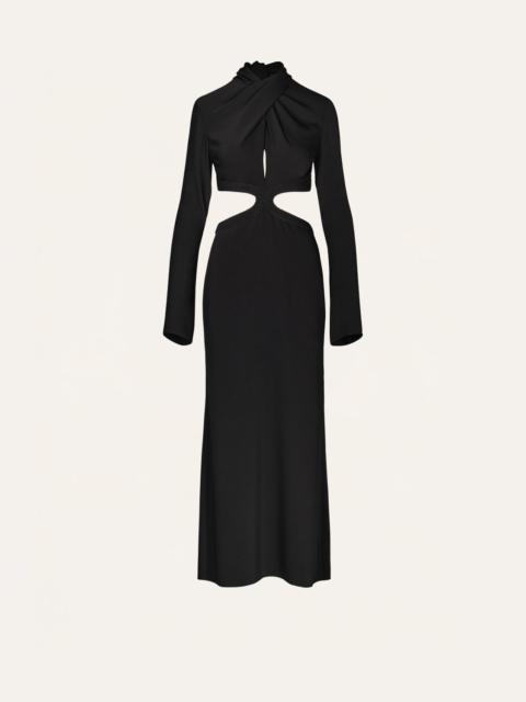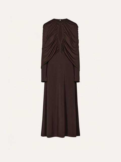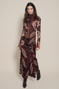 A long-sleeve jersey dress featuring an allover heritage print and ruched detailing through the waist and hips. The high neckline and elongated silhouette add definition, making it a sleek choice for day-to-evening transitions. Style with ankle boots or refined heels depending on the mood. Size and Fit: True to size. Designed for a slim fit. Please refer to our size chart for detailed guidance. Product Details: Closure: Tie At Back Composition: 96% Viscose, 4% Elastane Fabrication: Shiny Jersey Color: Black/Mocca/Sand/Red Made in Colombia Dimensions: Length 37.40''