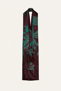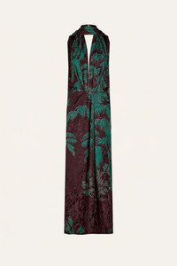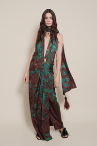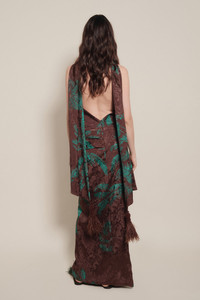 A classic Johanna Ortiz piece in rich jacquard. Designed with an open neckline, high slit, and a removable scarf that ties or drapes freely. The tropical motif adds dimension, and the fluid cut offers ease for occasion dressing. Size and Fit: True to size. Designed for a slim fit. Please refer to our size chart for detailed guidance. Product Details: Closure: Back Zipper Composition: 100% Viscose Fabrication: Printed Jacquard Color: Chocolate/Jade Made in Colombia Dimensions: Length 44.09''