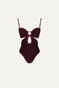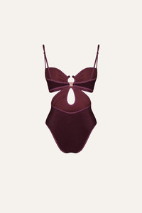 A textured terry one-piece with a heart-shaped neckline, featuring front cutouts for a bold, modern look. The design blends effortless style with a sleek silhouette, perfect for beachside elegance. Size and Fit: - True to size. - Adjustable shoulder straps. - Please refer to our size chart for detailed guidance. Product Details: Closure: Tie Fastening Composition: 85% Polyamide, 15% Elastane Fabrication: Terry Color: Madero Wine Made in Colombia