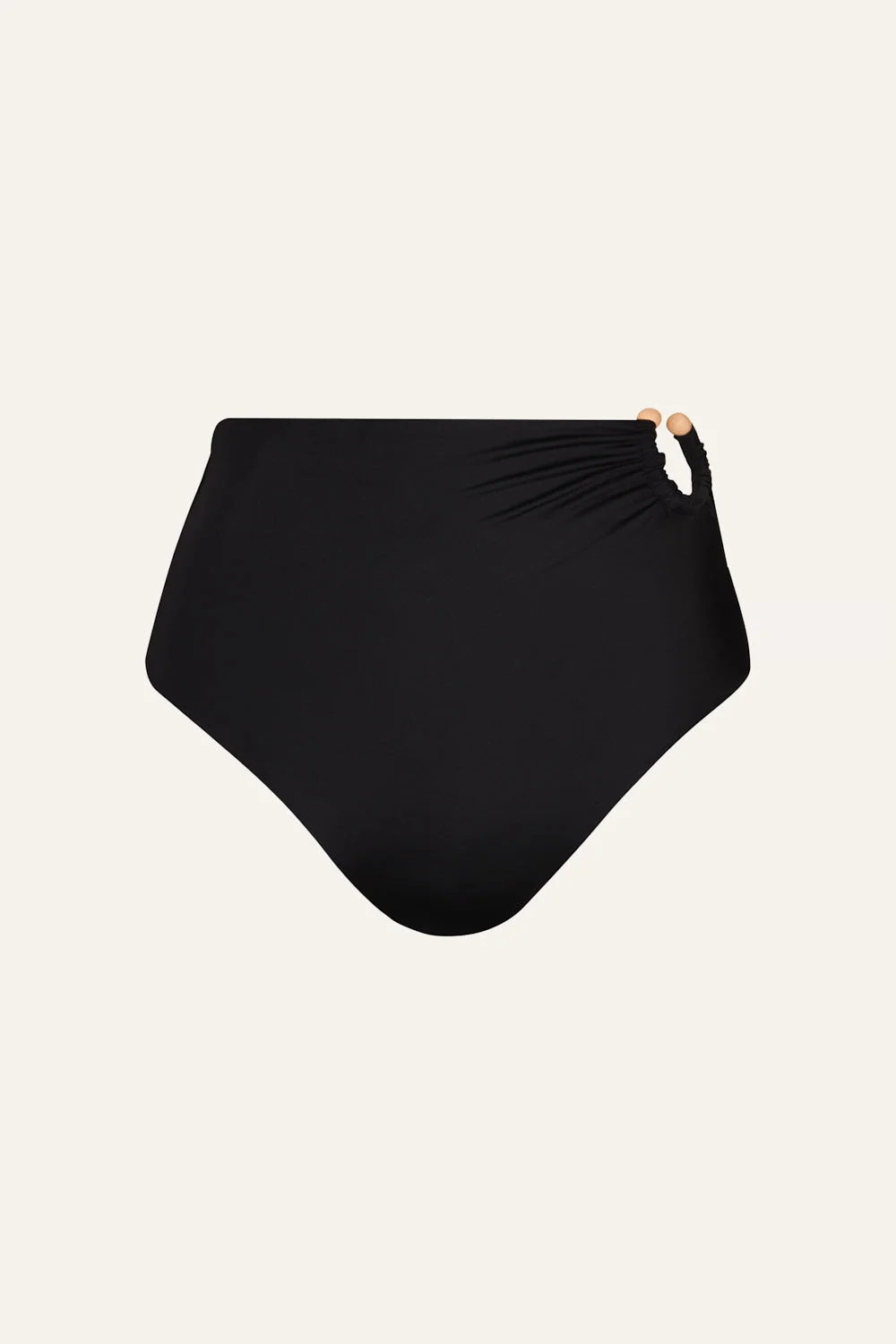 A high-rise bikini bottom with ruched detailing and a signature bead accent. A classic Johanna Ortiz silhouette, designed for mix-and-match styling with coordinating bikini tops. Fully reversible for versatile wear. Size and Fit: - True to size. - High-rise. - Please refer to our size chart for detailed guidance. Product Details: Closure: Slip On Composition: 78% Recycled Polyamide, 22% Elastane Fabrication: Lycra Color: Black Made in Colombia