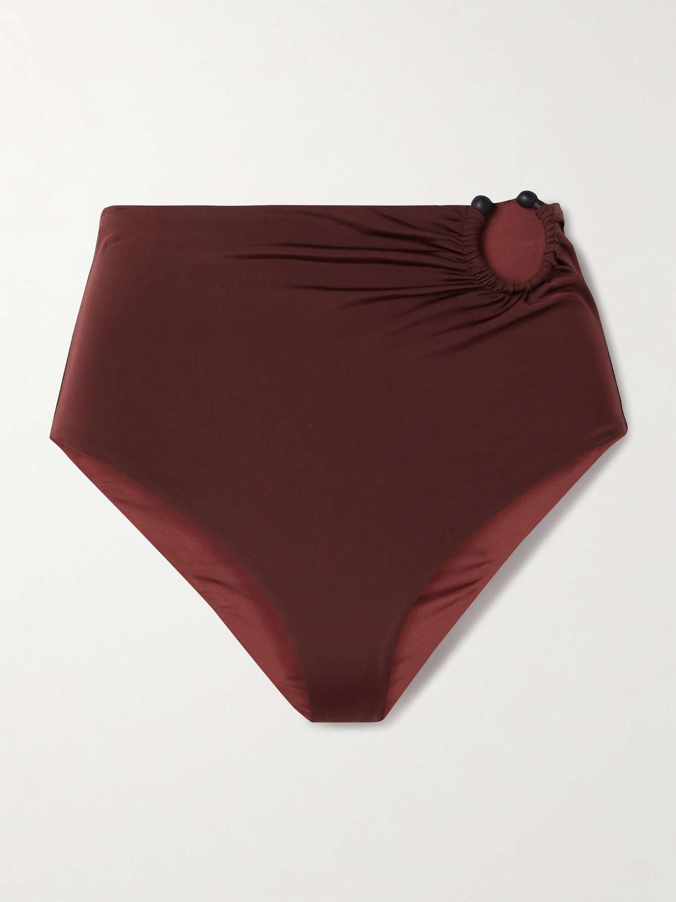 EDITORS'NOTES Johanna Ortiz's 'Taita' bikini briefs are detailed with a curved ring at the waistband, along with flattering ruching at the V-shaped back. They're cut from smooth stretch fabric in a rich chocolate shade. Wear yours on vacation with the matching 'Tangarana' bandeau top. SIZE & FIT - Fits true to size, take your normal size - High-rise briefs with medium coverage - Model is 177cm/ 5'10" and is wearing a size Small DETAILS & CARE - Chocolate stretch-polyamide - Lined at base - 79% polyamide, 21% elastane - Hand wash or dry clean - Lotion, sunscreen, oil and chlorine can cause discoloration of this item; this is not a manufacturing defect. Please follow care instructions to keep your swimwear in the best condition