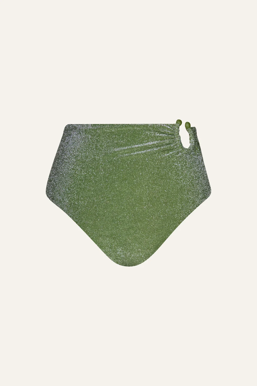 A high-rise bikini bottom with ruched detailing and a signature bead accent. A classic Johanna Ortiz silhouette, designed for mix-and-match styling with coordinating bikini tops. Fully reversible for versatile wear. Size and Fit: - True to size. - High-rise. - Please refer to our size chart for detailed guidance. Product Details: Closure: Slip On Composition: 66% Recycled Polyamide, 26% Metallic Silver, 8% Elastane Fabrication: Shimmering Lycra Color: Maguey Green Made in Colombia