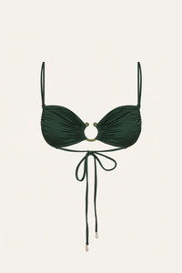 A bikini top featuring gathered detailing and a beaded ring at the center for a modern touch. Designed with slim straps and tie fastening for an adjustable fit. Perfect to pair with matching bikini bottoms from the collection. Size and Fit: True to size. Adjustable ties for a customizable fit. Please refer to our size chart for detailed guidance. Product Details: Closure: Tie At Back Composition: 80% Polyamide, 20% Elastane Fabrication: Lycra Dark Color: Green Made in Colombia