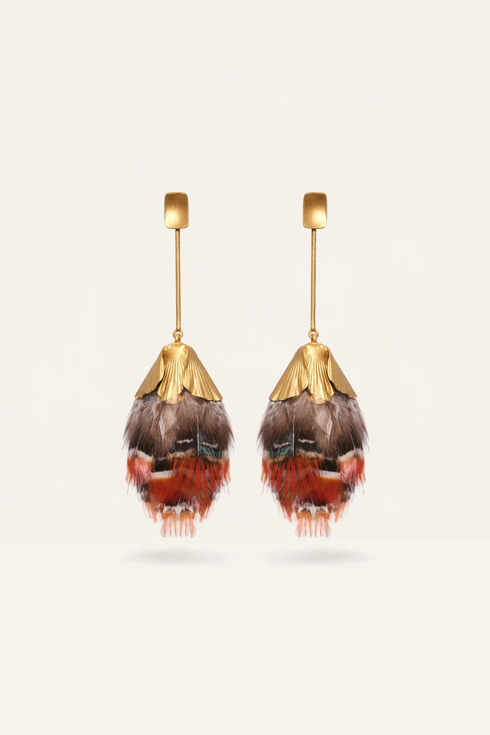 Delicate yet detailed, these floral earrings are inspired by Degas’s iconic ballerina skirts. Lightweight and expressive, they add a poetic finish to daytime looks or soft tailoring. Product Details: Closure: Post Fastening For Pierced Ears Composition: 60% Metal Brass Golding, 40% Feathers Fabrication: Metal Brass Golding And Feathers Color: Reddish Mocca/Paprika/Gold Made in Colombia Dimensions: Width 1.57'', Height 4.33''