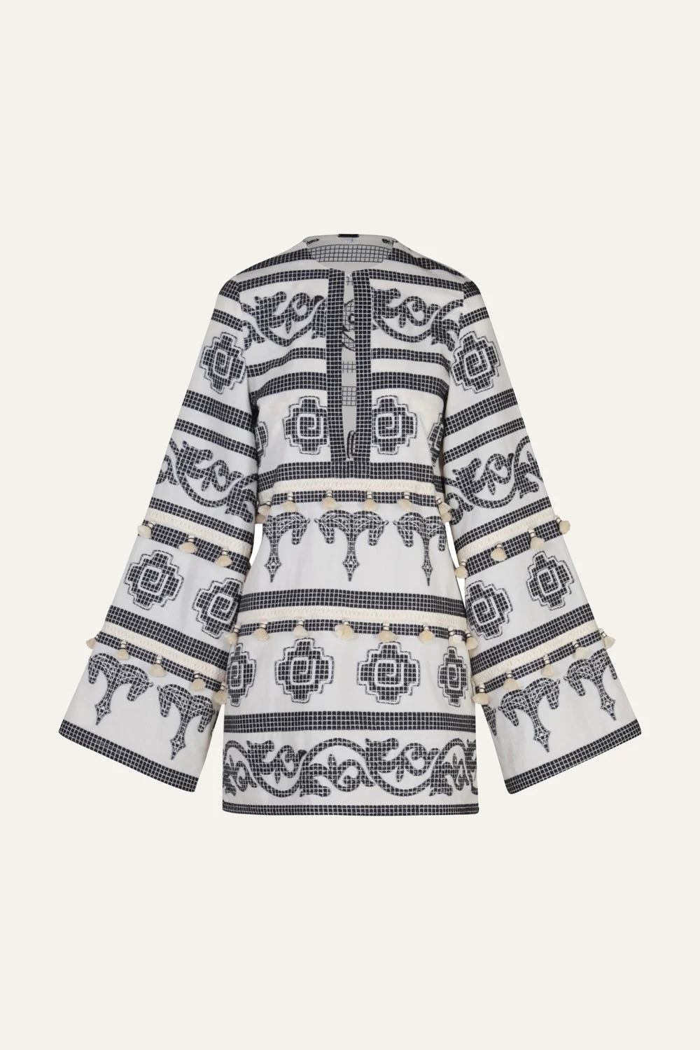 A tunic-style mini dress crafted from embroidered cotton, featuring intricate patterns, wide sleeves, and embroidered tassels. Designed for effortless versatility, it transitions seamlessly from a beach cover-up to an elevated daytime look. Size and Fit: - Boxy fit. - Please refer to our size chart for detailed guidance. Product Details: Closure: Tie At Back Composition: 100% Cotton Fabrication: Embroidered Cotton Color: Ecru/Black Made in Colombia Dimensions: Length 15.4''