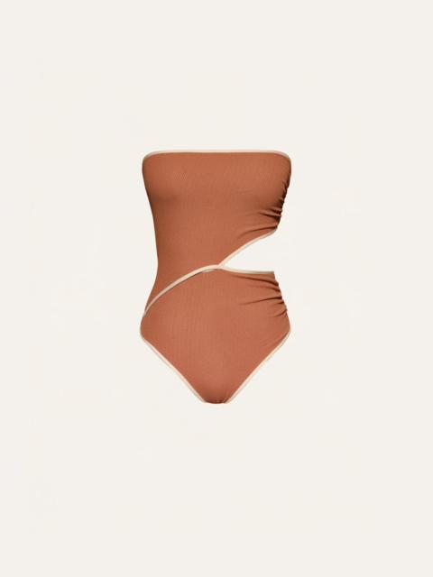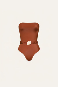 A sleek strapless one-piece swimsuit crafted in smooth Lycra. Accented with a removable braided belt featuring shell detailing, it carries a distinctive Johanna Ortiz touch while allowing versatile styling. Size and Fit: Designed for a slim fit. Please refer to our size chart for detailed measurements and guidance. Product Details: Closure: Slip On Composition: 78% Polyamide, 22% Elastane Fabrication: Lycra Color: Marsala Made in Colombia