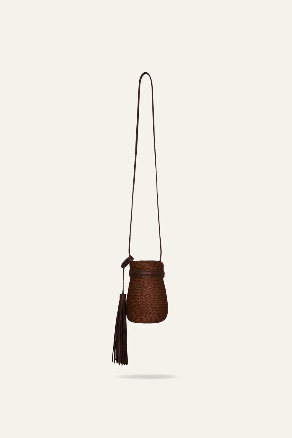 A reinvented mini crossbody, "Palacio de Jaipur," crafted with a chic leather tassel charm that can be worn or removed. This versatile accessory transitions smoothly from casual to elevated styles, making it the perfect addition to any outfit. Product Details: Closure: Slide On Cap Composition: 80% Natural Fiber (Iraca Palm), 20% Leather Fabrication: Natural Fiber (Iraca Palm) & Leather Mochila Color: Paprika Made in Colombia Dimensions: Width 5.9'', Height 11.0'', Drop 19.3''