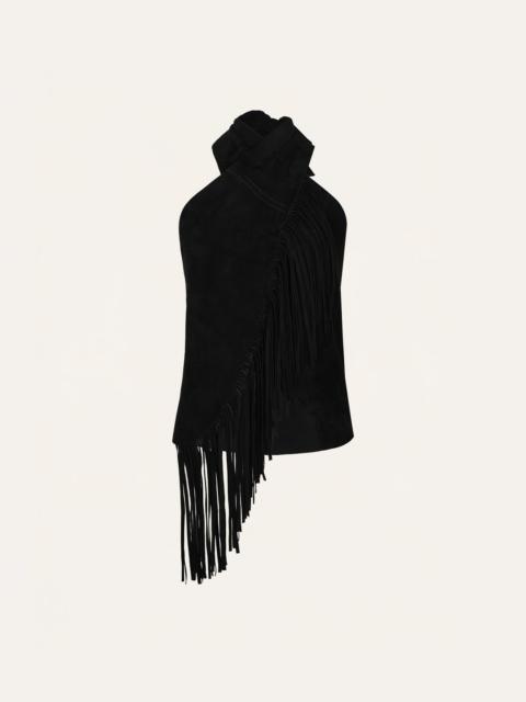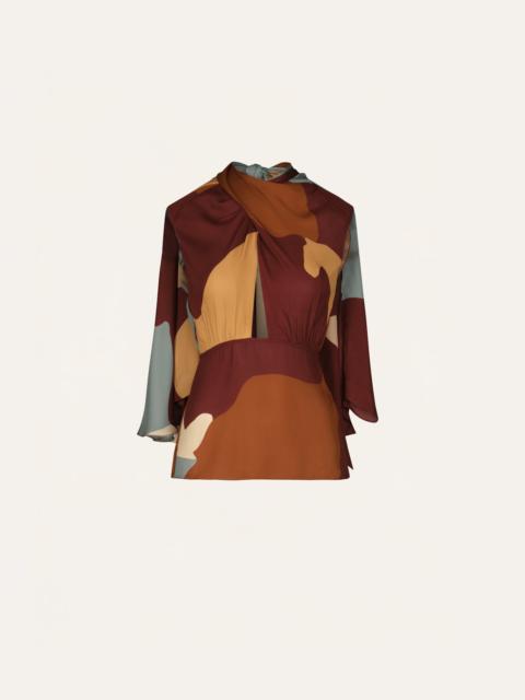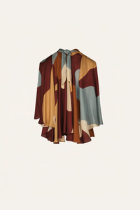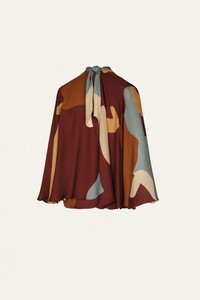 Halter-style silk top with a subtle twist at the neckline that creates soft gathers across the chest. Cape-like sleeves fall gently from the shoulders, adding movement and fluidity. A keyhole detail at the back completes the look. Style it tucked into tailored trousers or wear it loose over soft skirts or denim. Size and Fit: - True to size. - Please refer to our size chart for detailed guidance. Product Details: Closure: Tie At Back Composition: 100% Silk Fabrication: Silk Double Georgette Color: Red/Camel/Yellow/Blue Made in Colombia