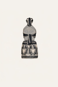 A classic Johanna Ortiz silhouette, this linen dress features a playful print, a halter neckline, and a cinched waist. Size and Fit: True to size. Please refer to our size chart for detailed guidance. Product Details: Closure: Tie At Back Composition: 100% Linen Light Linen Fabrication: Black/Ecru Color: Dimensions: Length 15.35'' Made in Colombia